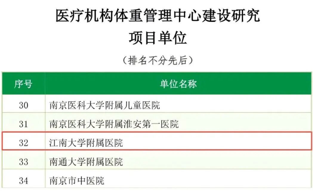 江南大学附属医院从全国近600家申报单位中脱颖而出,成功获批项目单位。此次项目获评标志着我院在体重管理的规范化诊疗与系统化管理领域综合实力正式跻身“国家队”行列。