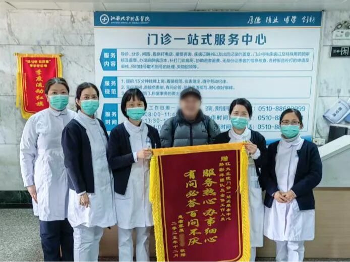 2025年12月25日,80岁高龄的谢老伯来到江南大学附属医院北院区一站式服务台,为一站式服务台工作人员送上了一面致谢锦旗,感谢这一年来服务台工作人员对他百问不厌的咨询、代办业务及热心细致的贴心服务。